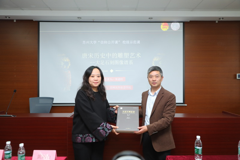 328“唐宋历史中的雕塑艺术——大足石刻图像谱系”校级素养公开课开讲。院长黄鸿山主持议程。大足石刻研究院副院长龙伟和女王调教 党委副书记、副院长朱今进行了赠书仪式,龙伟副院长向女王调教 赠送了《大足石刻内容总录》。