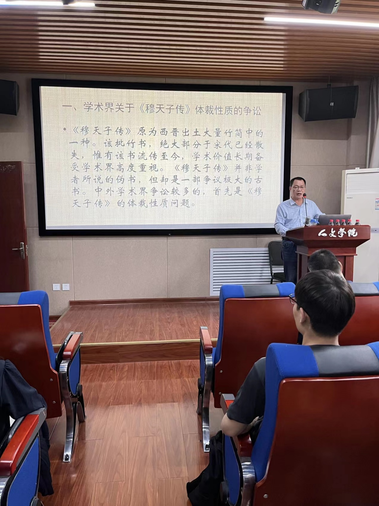 周教授从陈寅恪先生《〈桃花源记〉旁证》及引发的学术争议谈起,接着以《穆天子传》东巡交通地理为例,指出《穆天子传》东巡卷中的一部分地名均有确切所指;另有一部分地名虽有相对集中的流传区域,但并无确切地点;还有一部分地名与古代文献所记同名地名,张冠李戴,错杂混淆,和《穆天子传》东巡中的方位相悖,无法和古代文献中的地名对号入座。还有一些地名、族名,则于古代文献和金文等资料无征,并不具有历史地理价值。《穆天子传》东巡地理交通的写实与虚构两重风格呈现,则足以为《穆天子传》以小说神话为主,兼具多学科价值的体裁性质提供具有重要说服力的侧证。周教授强调指出,忽略《穆天子传》的小说、神话体裁性质,混淆文学作品中寓意与纪实的区分,滥用文史互证法,不仅不能做到文史结合,而且会给古史研究造成一系列混乱。在新的学术背景下,多学科视野下的《穆天子传》研究,应正视《穆天子传》以小说、神话为主,兼具多学科价值的文学类文献的体裁性质,准确把握《穆天子传》的产生背景、著述动机和意图;尊重现代学科的独立性,推进《穆天子传》研究在学术分工的基础上向着专业化方向发展;重视综合与比较研究,拓展与深化《穆天子传》研究的新旧领域;推进《穆天子传》研究范式从传统考据学向文化阐释学与跨文化研究转变。周教授的报告,内容丰富,思想深刻,语言生动,逻辑周严,彰显出扎实的学术功底、宽广的学术视野和卓越的史料理论修养。报告在师生热烈的掌声中结束。