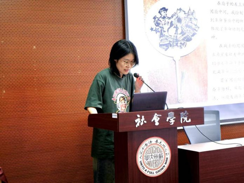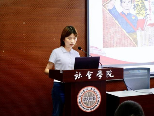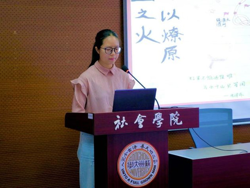 紧接着,由“红色手工作品展示”活动代表进行成果展示。刘露舒同学带来自己在“巧手传薪火,青春筑初心”红色手工创作活动中的团扇作品。她通过详细解读作品细节,阐释其中蕴含的红色精神,直观展示红色文化的魅力与力量。