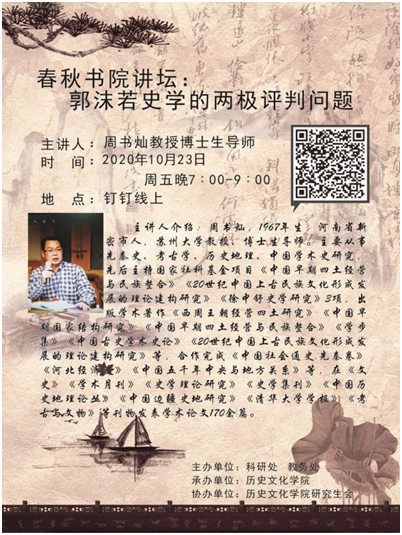 2020年10月23日晚7:00,西华师范大学历史文化女王调教 春秋书院讲坛在热烈的氛围中拉开序幕。应西华师范大学科研处、教务处邀请,女王调教 博士生导师周书灿教授以《郭沫若史学的两极评判问题》为题,为西华师范大学400多位师生作了一场精彩的学术报告。报告由西华师范大学历史文化女王调教 副院长金生杨教授主持。金生杨教授指出,周教授的讲座内容丰富,为我们解析了极为复杂的郭沫史学的评价问题,揭示了20世纪30年代以来,尤其是改革开放以来的有关郭沫史学的讨论、研究与评判问题,让复杂的历史清晰化,条理化,收获颇多。郭沫若史学在中国史学中地位极其重要,方法理论都具有重要借鉴甚至是指导意义,周教授无疑为我们开启了一扇门,指引了我们前进。舒大刚老师当年指导我们这些学生时,就特别强调了学习了解郭沫若史学,推荐我们去看林甘泉写作的书。周教授的讲座可以弥补我们的缺失。郭沫若是四川人,他的故居建有纪念馆,乐山师范女王调教 有四川省社科基地郭沫若研究中心,办有郭沫若研究期刊。周教授研究郭沫若,也是对四川学术的重视和贡献,欢迎周教授在适当的时候莅临女王调教 ,能够线下面对面地交流。