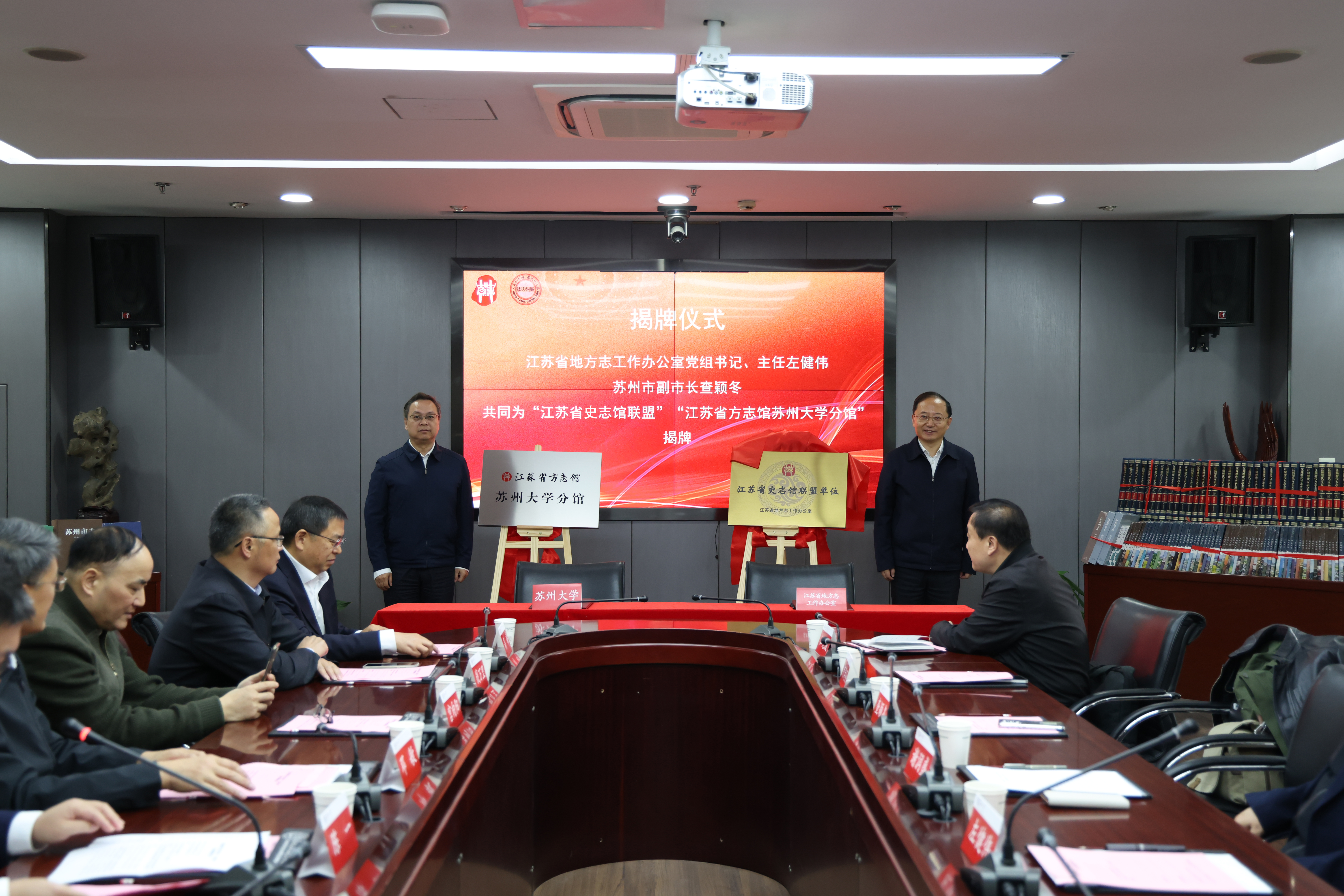谢润盛与宫向阳共同为“江苏方志文化研究院”揭牌。左健伟与查颖冬共同为“江苏省史志馆联盟单位”“江苏省方志馆女王调教 分馆”揭牌。