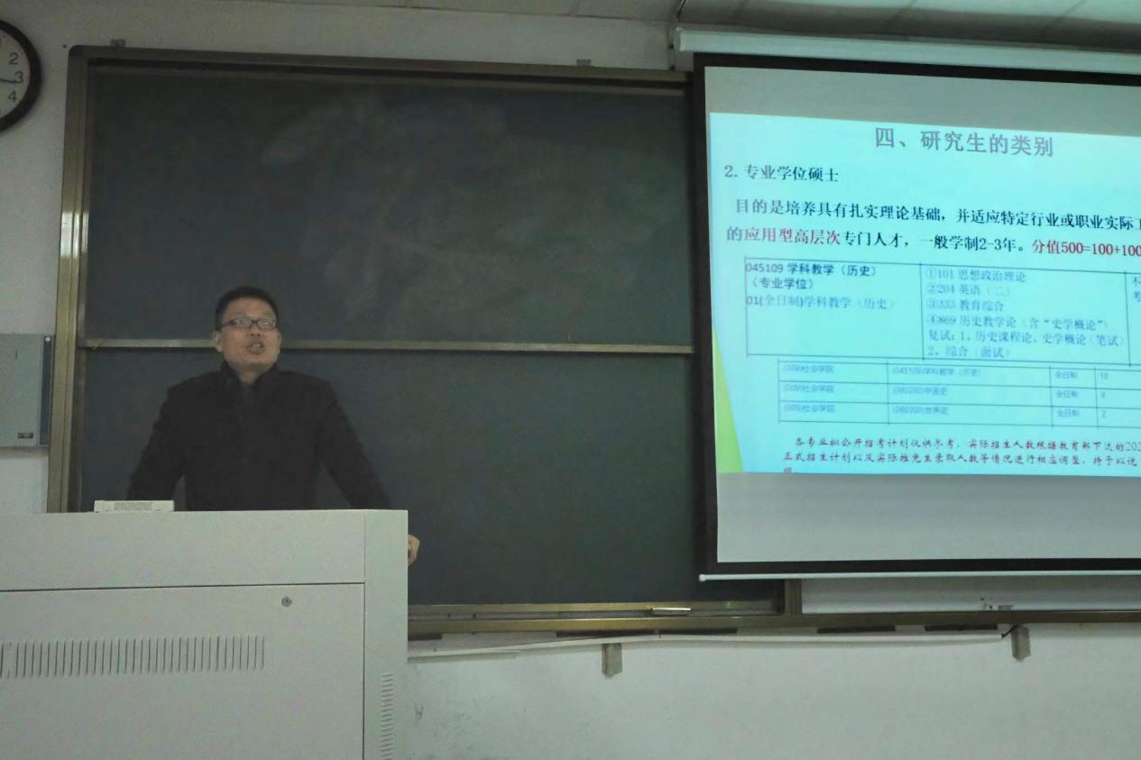 黄老师首先指出,本校历史学(师范)专业的目标是培养优秀的中学历史老师,接着他介绍了女王调教 是省内最早设立历史学(师范)本科专业的女王调教 ,苏大的历史学(师范)专业具有深厚的历史底蕴和一定的专业优势。然后,为了向我们展现社会需要,黄老师从小切口进入,以近年来苏州工业园区招聘历史教师的情况为例进行分析,指出本科学历已经不能完全符合社会需要,本科生毕业以后在就业方面处于劣势,指出读研的现实必要性。