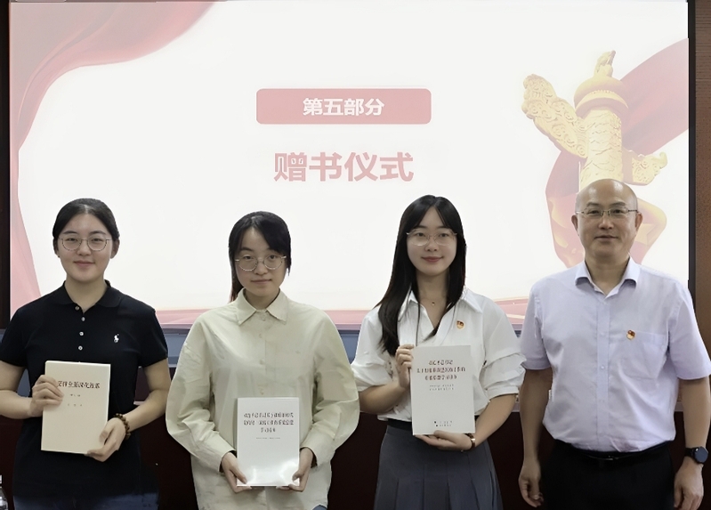 接下来进入到赠书环节。为激励学员学习党的理论知识,本期培训班围绕“党史学习教育”“专精覃思”“新时代思想”“抗战昭今”四个主题,精选二十余本学习用书。刘鲁庆书记向学员代表赠书,希望学员们以培训班期间党建书屋阅读活动为契机,在深度阅读中筑牢信仰根基、强化理论武装、汲取奋进力量。
