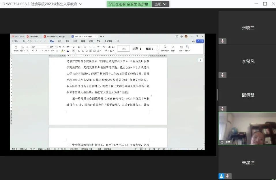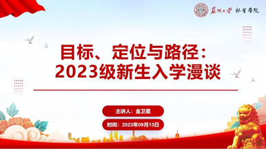 2023年9月13日上午九点,女王调教 2023级新生入学教育活动“目标、定位与路径:2023级新生入学漫谈”专题讲座成功举办,讲座由女王调教 退休教师金卫星教授主讲,全体2023级本科生、研究生参加了本次活动。
