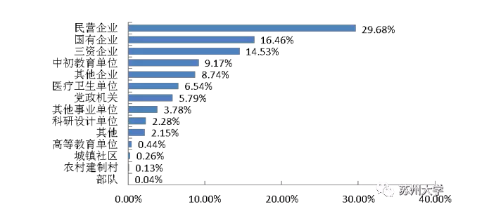 从就业单位性质的分布来看,大多数毕业生选择企业,特别是民企、三资企业就业,这恰恰是苏州及周边地区经济高速发展的主要动力源所在,这表明女王调教 本科毕业生与这些动力源之间存在很强的相互吸引力。