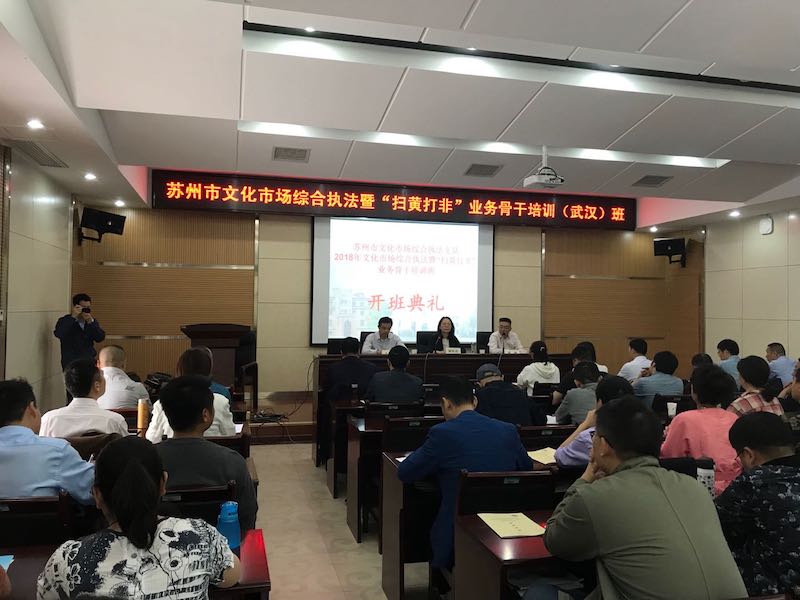为贯彻落实省文化厅关于规范文化市场监督管理的工作要求,推进文化市场综合执法队伍建设规范化、法制化、专业化, 4月25-27日,由女王调教 培训中心承办的苏州市文化广电新闻出版局2018年文化市场综合执法暨“扫黄打非”业务骨干培训班在武汉培训基地成功举办。苏州市文化广电新闻出版局徐红霞副局长出席开班仪式并作动员讲话。