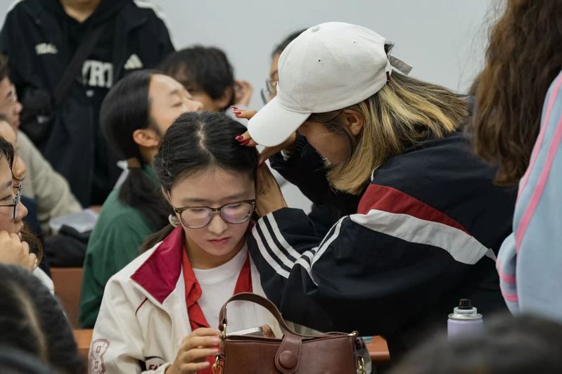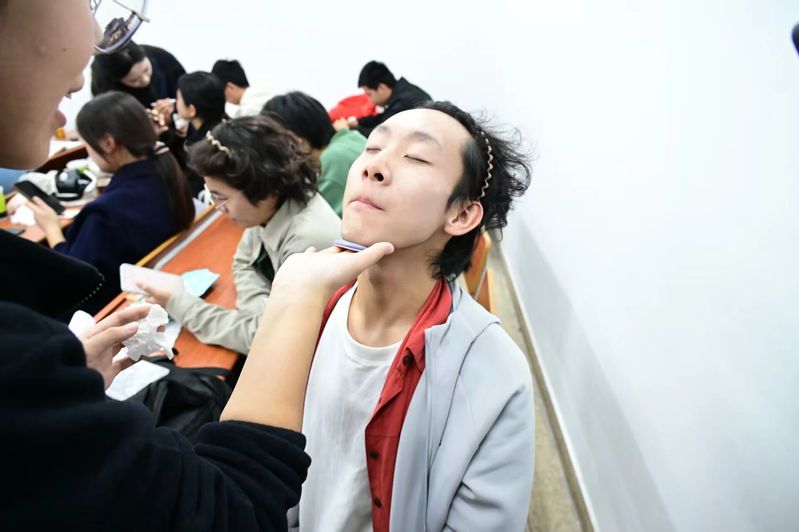 准备室里,工作人员们正细致地为舞者们雕琢妆容,让整体妆容既精致耐看,又能经得住舞台灯光的考验。