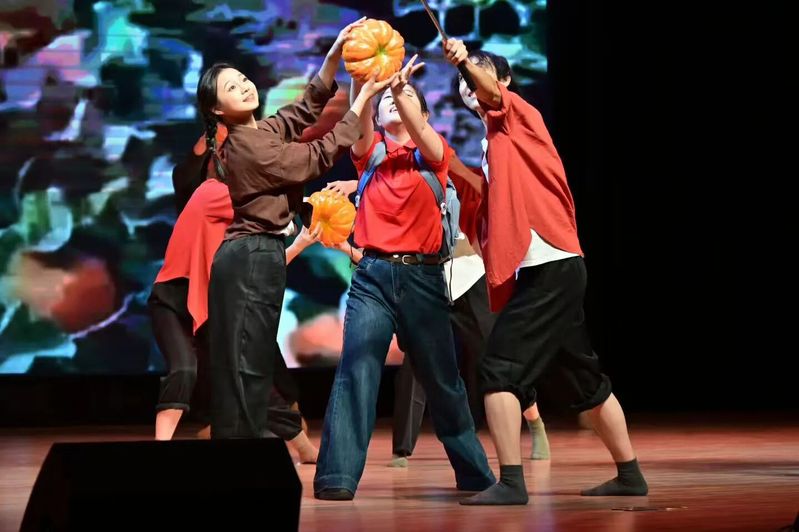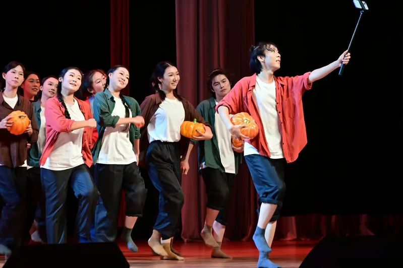 随着旋律渐次明快,其余舞者携果蔬、南瓜等农产品道具翩然入场,如点点星光汇聚而来。队形时而围拢,时而散开。每一次短暂的停留,都引起了观众雷鸣般的掌声。