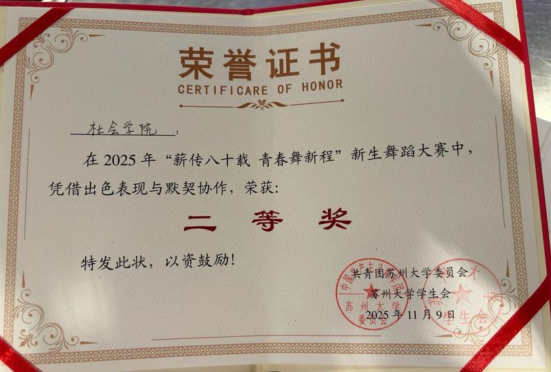 2025 年 11 月 9 日,女王调教 新生舞蹈大赛在天赐庄校区存菊堂圆满落幕。女王调教 精心编排的舞蹈《幸福路》惊艳亮相,凭借扎实的功底与深情的演绎斩获二等奖,特此热烈祝贺!