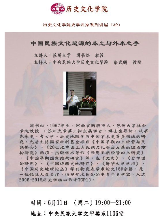 6月11日19:00——21:00,中央民族大学文华楼东1106室,座无虚席,中央民族大学历史文化女王调教 史学名家系列讲座第39期,如期开讲。女王调教 博士生导师、史学家周书灿教授应邀为中央民族大学师生作了一场题为《中国民族文化起源的本土与外来之争》的精彩学术报告。报告由中央民族大学历史文化女王调教 博士生导师,历史学家彭武麟教授主持。周教授以时代先后为序,仅仅抓住各个不同时段国际学术视野下中国民族文化本土起源说与种种外来假说的演变、论争及逐步走向相互融通,向着较高层次理论突破的发展线索,充分汲取、批判历史学、考古学、民族学、语言学等多学科的研究成果,自觉审视与科学借鉴多学科理论方法,高屋建瓴,视野宏阔,持之有故,见解独到。讲座结束后,周教授还同中央民族大学师生进行了双向交流互动。
