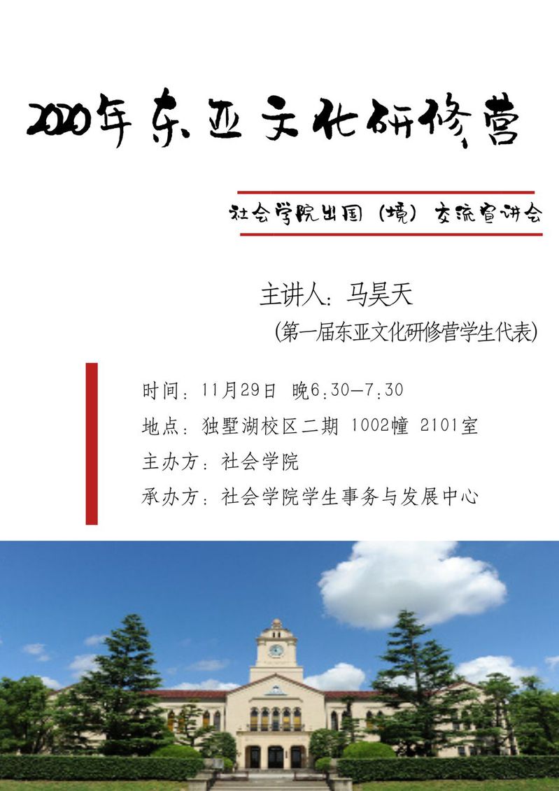 为了帮助同学们了解项目详情,女王调教 将于11月29日(星期五)晚上6:30-7:30在独墅湖校区二期文综楼1002幢2101举行“2020年东亚文化研修营专场宣讲会”,届时将邀请参加第一届东亚文化研修营的学生代表马昊天同学和院学工办主任兼外事秘书马竞飞老师为大家做项目简介和现场答疑。