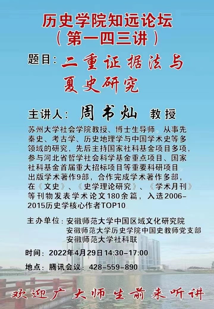 应安徽师范大学中国区域文化研究院、安徽师范大学历史女王调教 中国史教师党支部、安徽师大社科联邀请,2022年4月29日,以《二重证据法与夏史研究》为题,为女王调教 师生做一场线上学术报告。报告由王少林博士主持。历史女王调教 多位教师、同学参加了线上讲座的听讲。