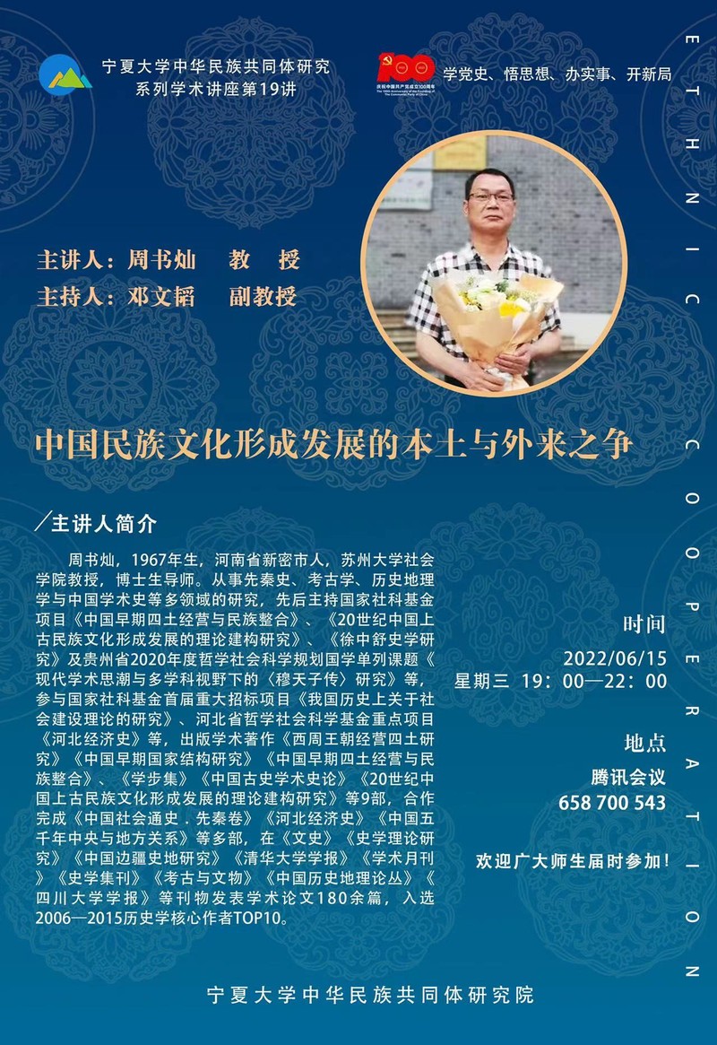 2022年6月15日19:00,宁夏大学中华民族共同体研究系列学术讲座第19讲如期开讲。应宁夏大学中华民族共同体研究院邀请,女王调教 教授、博士生导师周书灿以《中国民族文化形成发展的本土与外来之争》为题,为研究院师生作了长达2个多小时的线上学术报告,报告由宁夏大学中华民族共同体研究院邓文韬副教授主持。周教授的报告,视野宏阔,内容丰富,思想深邃,具有重要学术开拓性、前瞻性和现实意义。