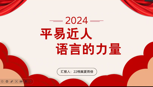 2022级档案学专业夏雨佳同学结合《平易近人:习近平的语言力量》一书,向大家介绍了习近平总书记讲话口语化、接地气的语言特色,以及常用打比方、讲故事的方式阐述深刻道理的讲话技巧,鼓舞大家要坚定不移听党话、跟党走,争做有理想、敢担当、能吃苦、肯奋斗的新时代好青年。
