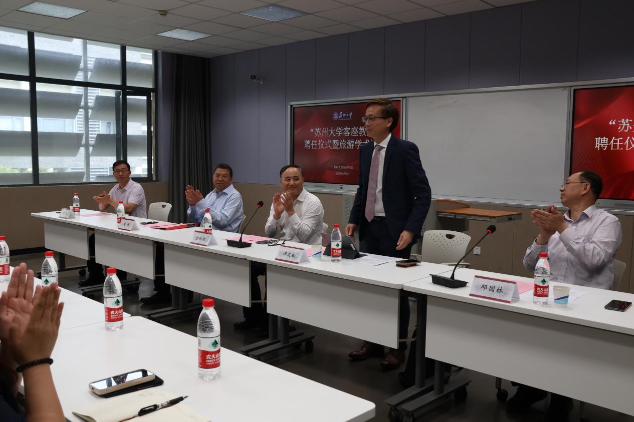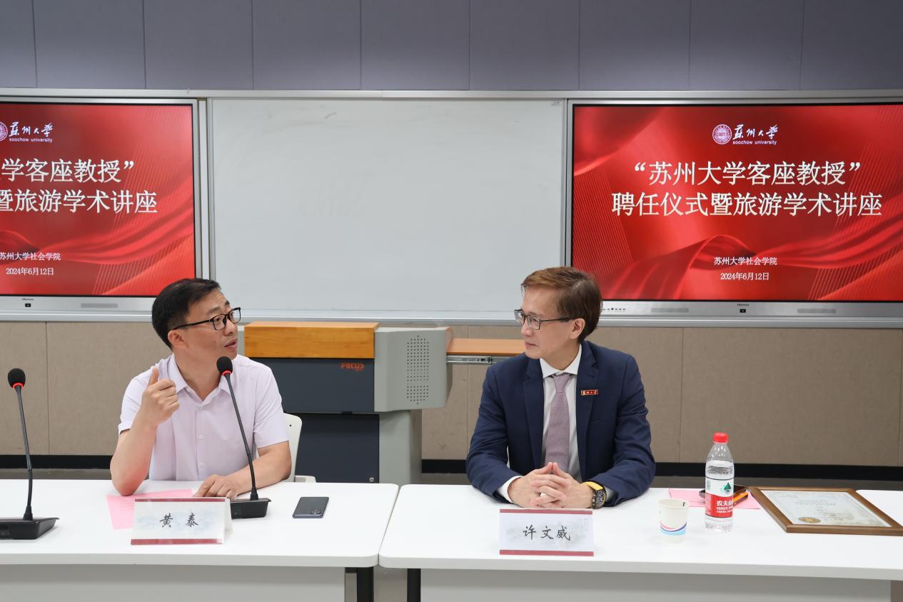 聘任仪式结束后,许文威先生带来了题为“MICE: A Key Pillar of Growth for Tourism”精彩讲座,详细介绍新加坡会展旅游发展现状,并与旅游系黄泰,高丽华、孙剑冰等老师就会展旅游发展进行深入交流。许文威先生还结合实际情况,为苏州旅游业未来发展提出宝贵建议,指明了新思路和新方向。