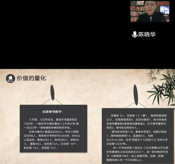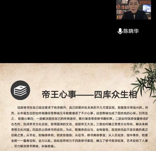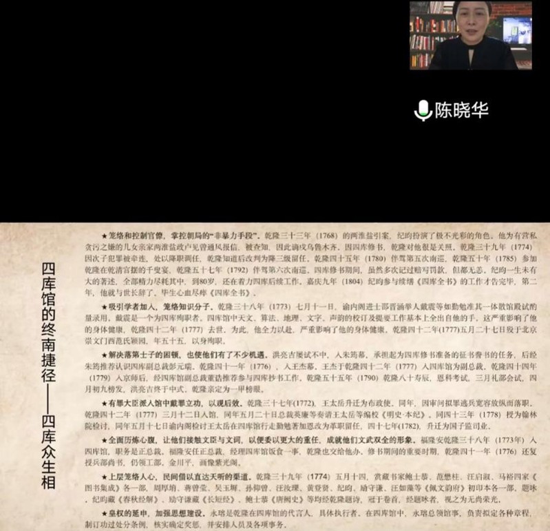 讲座伊始,陈老师从四库文化的弘扬普及出发简述了《四库全书》作为宝贵文化遗产对于构建具有中国特色的哲学社会科学体系、实现对优秀传统文化的创造性转化与与创新性发展、构建中华民族共同体的重要意义,并指出《四库全书》给予今人的不仅仅是文字,还有文字背后的各色人等和故事,以及蕴含其中的文化现象,而探究四库修书背后的文化现象也正是本次讲座的目的所在。