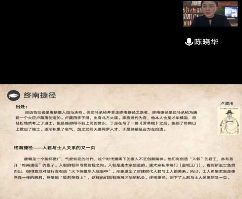 在此基础之上,陈老师对终南捷径这一现象做出进一步评析。首先,陈老师指出,终南捷径在历史上并不少见,姜子牙、诸葛亮、袁世凯某种意义上都可以视作采用了终南捷径。其次,对于终南捷径,要予以辩证的看待:终南捷径虽然帮助了一些“野心家”实现其政治野心,但也确实使得许多贤能之人如诸葛亮得以步入仕途,施展抱负。陈老师对此总结道:终南捷径是中国古代史上一个重要的文化现象,创下了人君与士人关系的又一页,能充分反映中国古代知识分子的心态。