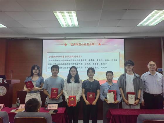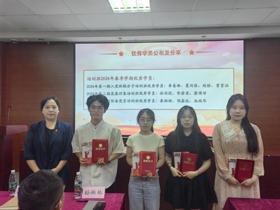典礼第四项议程为优秀学员公布与经验分享。朱今书记为入党积极分子培训班优秀学员颁发荣誉证书,并赠书《红星照耀中国》作为纪念;邓国林书记为发展对象培训班与预备党员培训班优秀学员颁发荣誉证书,并赠书《<中国共产党纪律处分条例>学习解读》作为纪念。