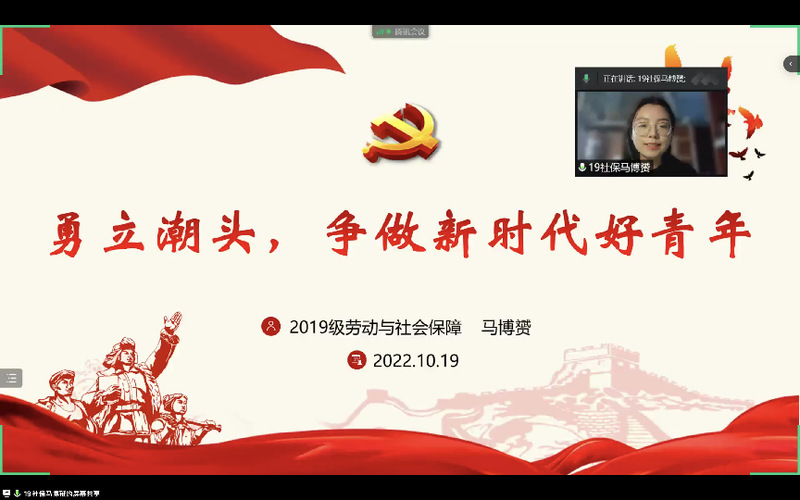 典礼第三项,学员代表发言。2019级劳动与社会保障专业的马博贇同学以“勇立潮头,争做新时代好青年”为主题,倡导青年大学生在成为党员的路上要做到学习书本知识和参与社会实践相结合,提高科学知识水平和增强思想道德修养相结合,不断积累知识,开拓自身视野,提升自我境界,永远听党话、跟党走。
