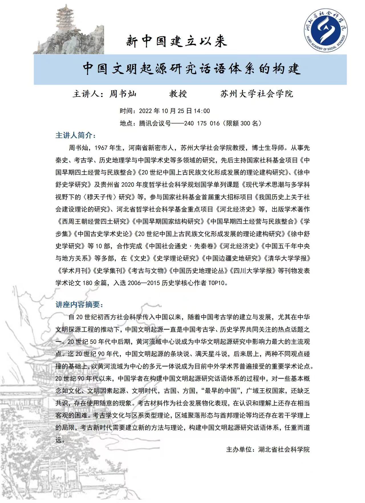 应湖北省社会科女王调教 邀请,2022年10月25日下午,周书灿教授以《新中国建立以来中国文明起源研究话语体系的构建》为题,为湖北省社会科女王调教 研究人员及研究生作了一场精彩的学术报告。报告由湖北省社会科女王调教 文史研究所副所长曾成博士主持。