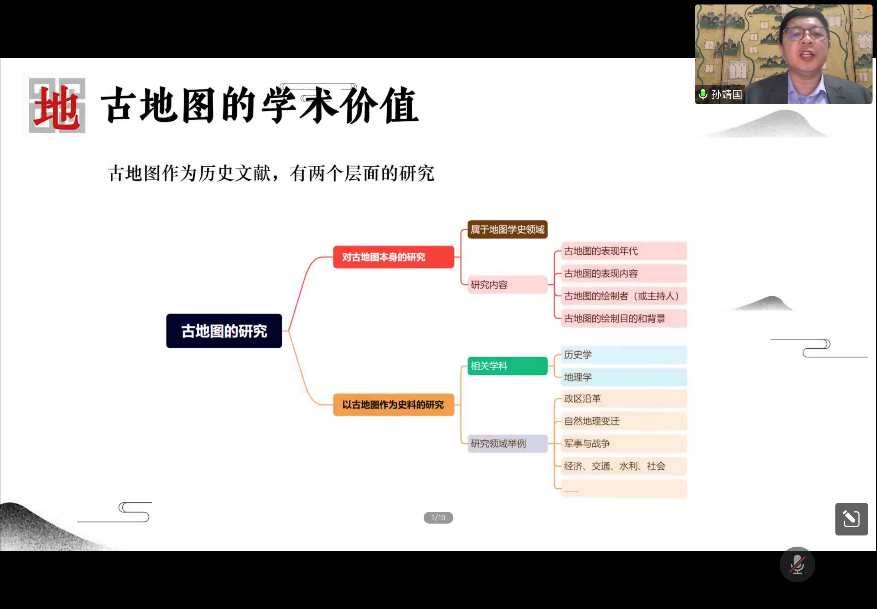 在此基础上,孙老师进一步对古地图作为重要历史文献的学术价值进行了分析。古地图的研究包含两个方面,一为对古地图本身的研究,通过古地图表现的年代、内容、绘制者或主持人、绘制的目的和背景等信息,探索其反映的历史进程及历史事件;二为以古地图作为史料的研究,涉及历史学、地理学等领域,涵盖政区沿革、自然地理变迁、军事与战争等丰富内容。在充分肯定古地图在历史研究中重要补充作用的同时,孙老师也指出要提高鉴别、考证能力,从而更好地利用古地图资料进行研究。