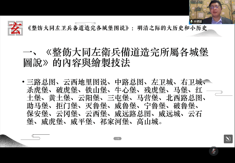 关于《图说》的绘制时间与背景,孙老师根据自身研究成果进行了简要的讲解。基于《图说》中各城堡“定经制”官军原额与顺治六年清政府于宣大二镇“更定经制”员额不同,《图说》中叙及的城堡沿革,大顺政权占领大同,姜瓖投清这些史实,推断此图应绘制于清顺治二年八月之后,顺治五年十二月之前,是大同总兵姜瓖降清之后,清政府派官对大同左卫道所辖城堡的军政建置进行调整所绘。《图说》中所载职官与兵额调整,反映明末屯堡在军事防守、保障交通、促进经济等方面的职能,以及清初在统一长城沿线地区后裁撤冗官、冗兵的原因,是展现明清之际大历史和小历史的鲜活实证。
