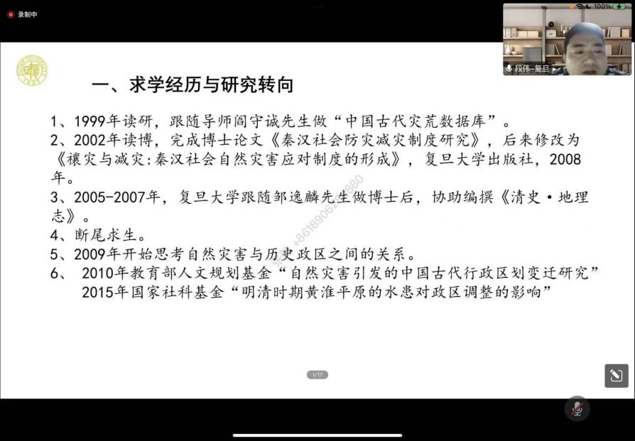 2022年11月23日晚19:00,复旦大学中国历史地理研究所段伟教授应邀为女王调教 历史系作题为《历史政治地理对自然灾害的响应分析》的线上讲座,这也是本年度东吴人文系列讲座的收官之作。讲座由女王调教 历史系王晗副教授主持,余同元教授为与谈人,校内外与会师生290余人。