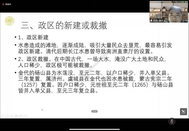 基于以上历史政治地理对自然灾害的响应方式四种类型的分析,段伟老师在讲座最后做出了总结。纵观中国历史,自然灾害影响历史政治地理的案例非常普遍,其中地名更改由于实际作用不大,次数相对较少,而具有较强破坏力的水灾、地震及沙漠化通过改变地貌,影响人口与赋税,进而对政区变化产生巨大作用。此外,段伟老师指出我们应该认识到政治地理的变动是一门高超的学问,牵一发而动全身,从历史上看,不是每次政区调整都有益于地方管理,有的反而造成政区之间相互争夺利益、相互掣肘的情况,并不利于对自然灾害的治理和防范,因而有时尽管发生严重自然灾害,但政区没有发生变动,有其深层因素的充分衡量。面对自然灾害严重程度与历史政治地理是否变动不对等的情况,我们更应该注意到其背后有更多更复杂的因素发挥作用,需要进一步地分析与研究。